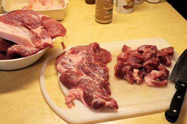 Cut the meat from the bone and then cube. You want no more than about 20% fat and 80% meat. I opted for a little less fat and trimmed some away but if you do that be sure to use a little oil or cooking spray when cooking to prevent sticking.